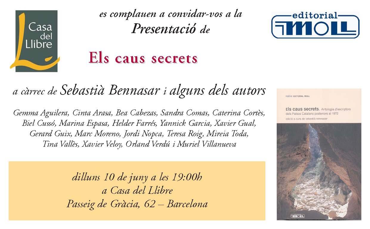 Avui, demà i dimecres es presenta el llibre Els caus secrets a Barcelona, València i Girona, respectivament. Com que aquestes coses no passen gaire sovint, aprofitarem aquests dies per veure’n alguns mots i passatges. Si voleu conèixer uns quants dels autors antologats, els trobareu avui a les 7 del vespre a la Casa del Llibre (Passeig de Gràcia, 62).